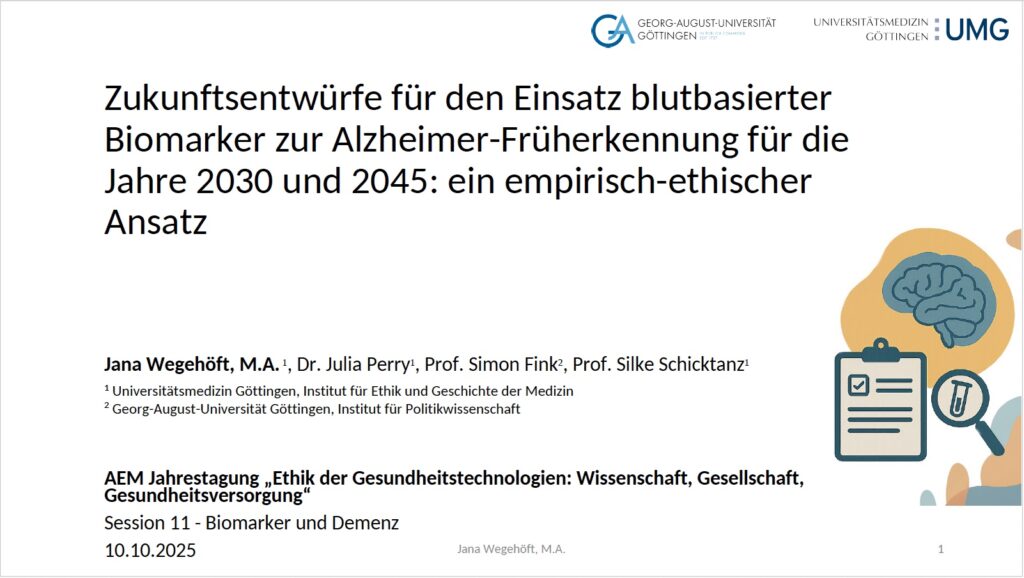 As part of the AEM Annual Conference “Ethik der Gesundheitstechnologien: Wissenschaft, Gesellschaft, Gesundheitsversorgung” from October 9-11, 2025, Jana Wegehöft gave a presentation entitled “Zukunftsentwürfe für den Einsatz blutbasierter Biomarker zur Alzheimer-Früherkennung für die Jahre 2030 und 2045: ein empirisch-ethischer Ansatz,” offering insights into current developments and possible scenarios in the field of biomarkers and dementia.